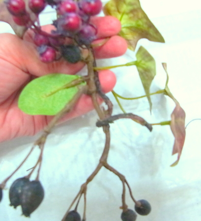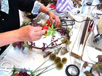 (3) ツルをほどいた赤いベリーを巻き付け、黒いベリーはワイヤーかグルーで固定します。