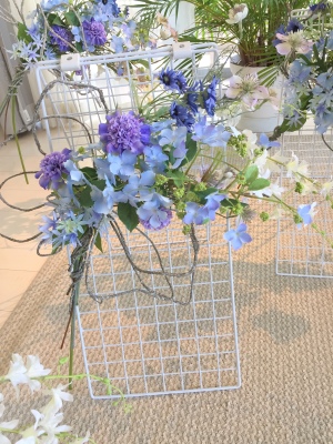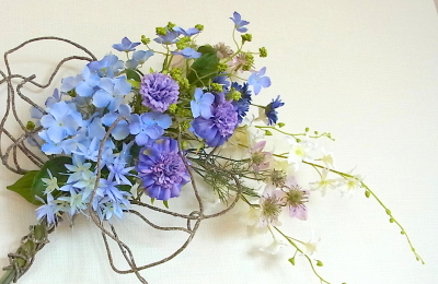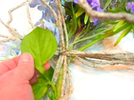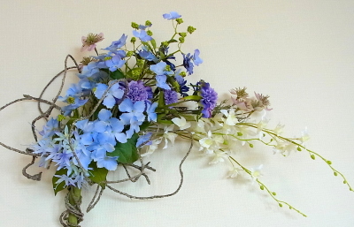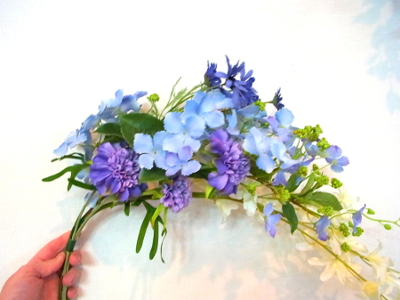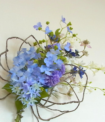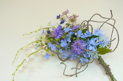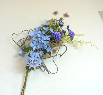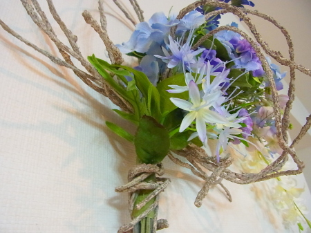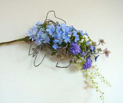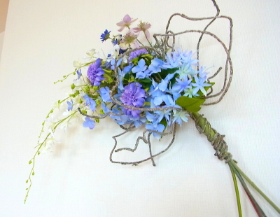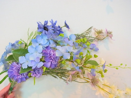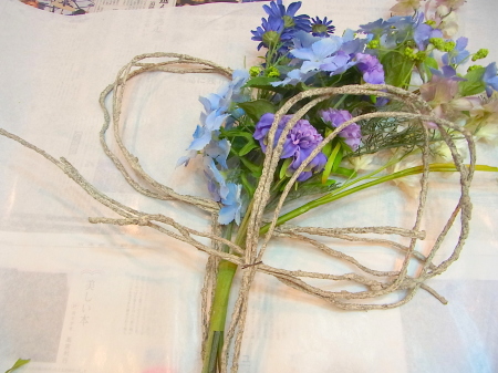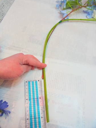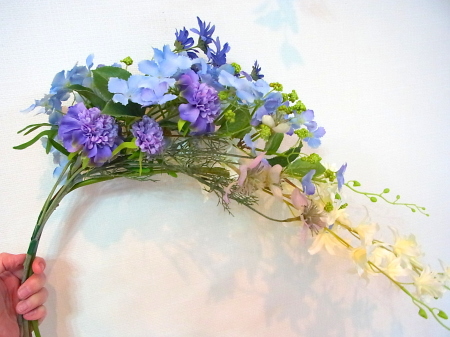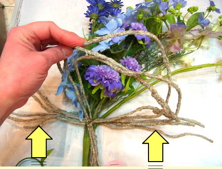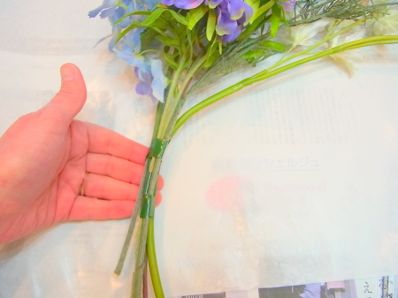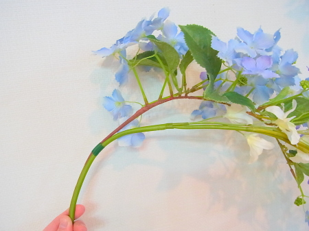 アジサイと、オーキッドの枝は長いので安定させるため 10センチほど下がったところもテープで巻きます。 |