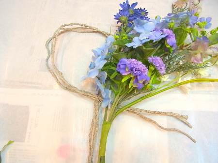 一か所テープでとめますが、できるだけ、お花がたくさん正面をむくようにとめます。