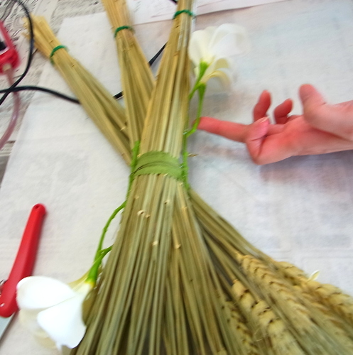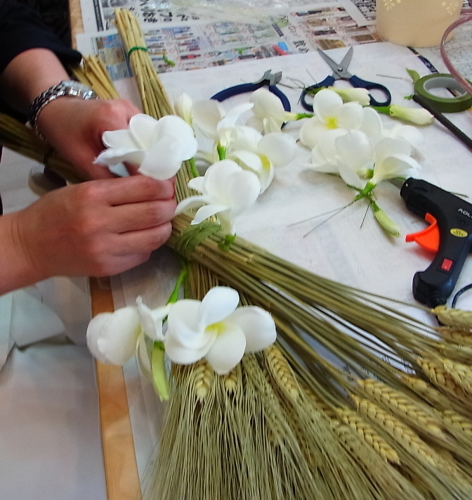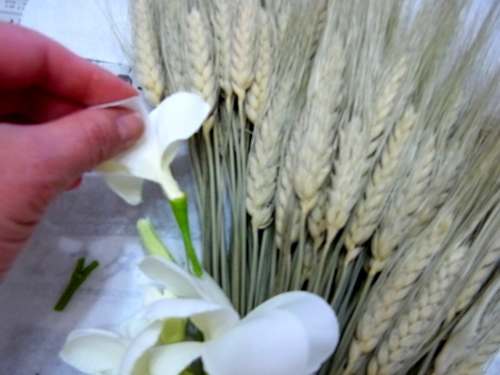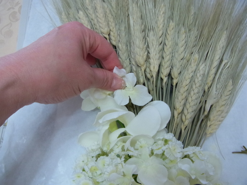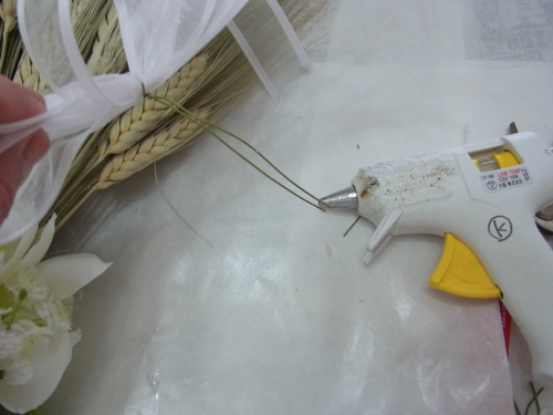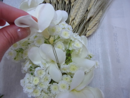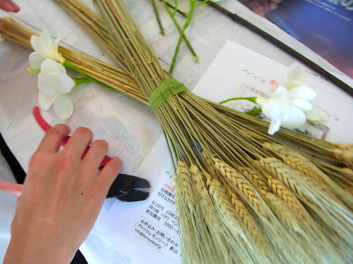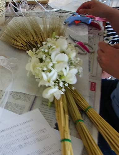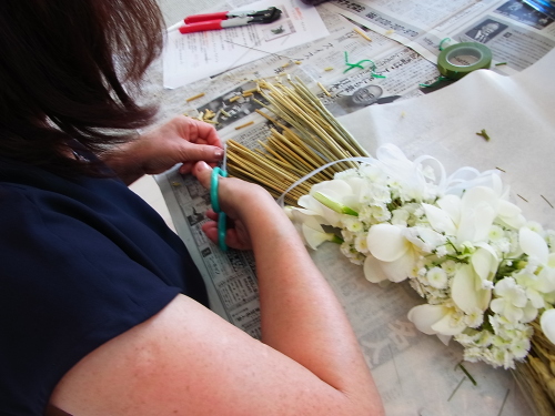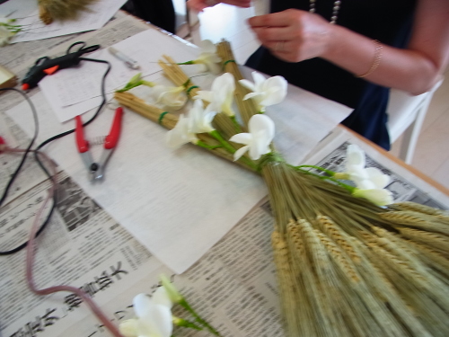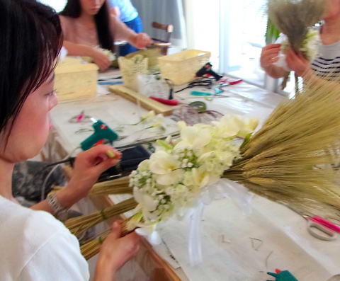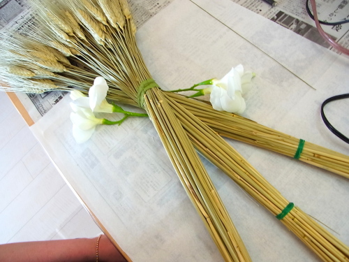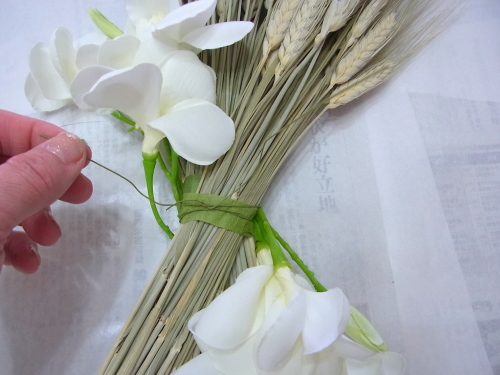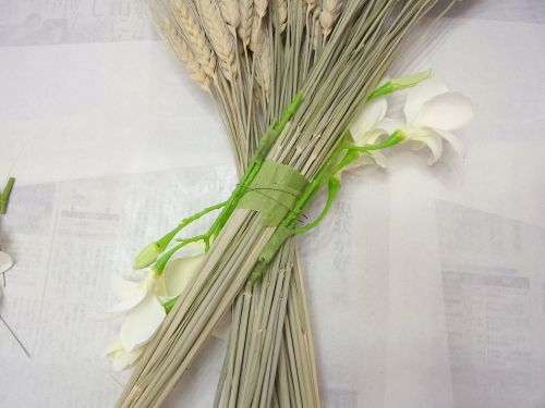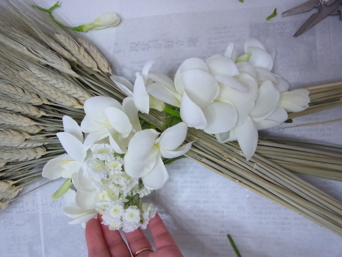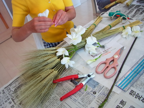 アレンジの後半は足場も多くなるので、花や麦に直付けもできます |