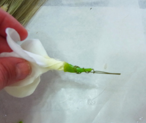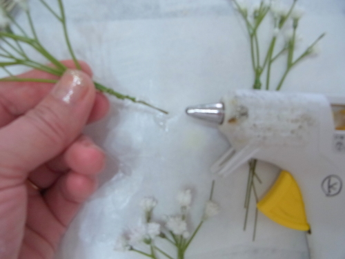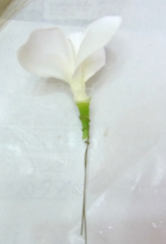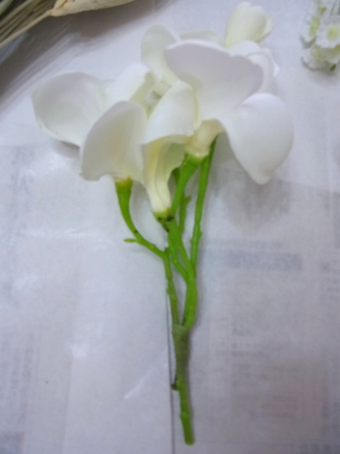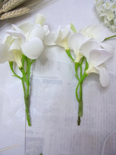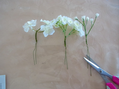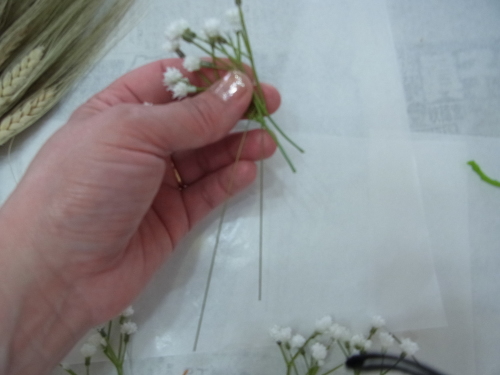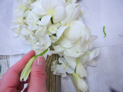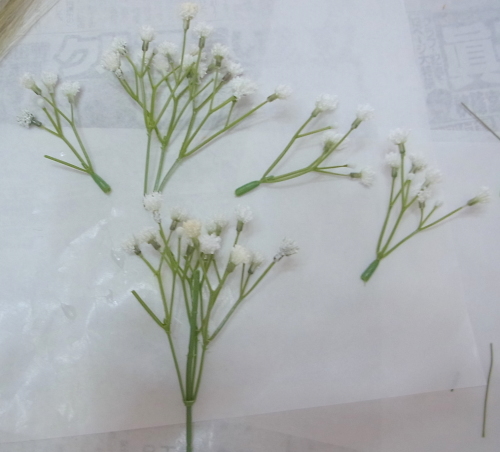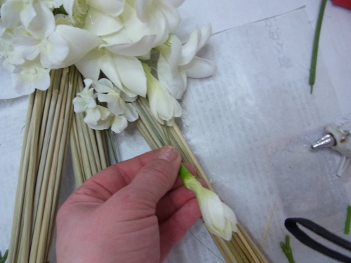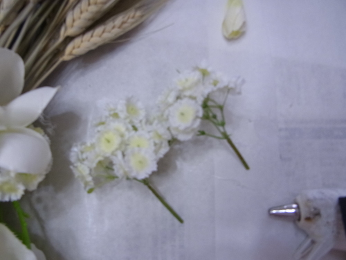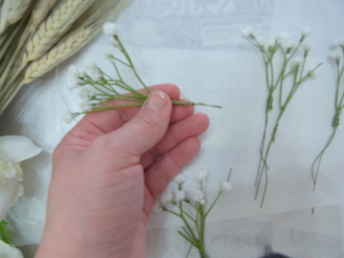 かすみ草は仕上げで キャップになっている真ん中の茎をひっぱると 串から抜けます。小分けにして 又かけのワイヤリング |