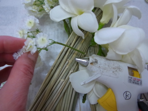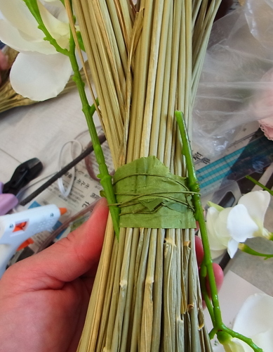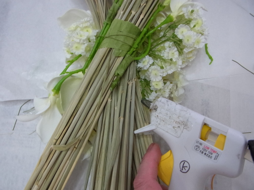 束の脇のほうは、ワイヤリングせず 茎のグルーをつけて、直接はりつけています |