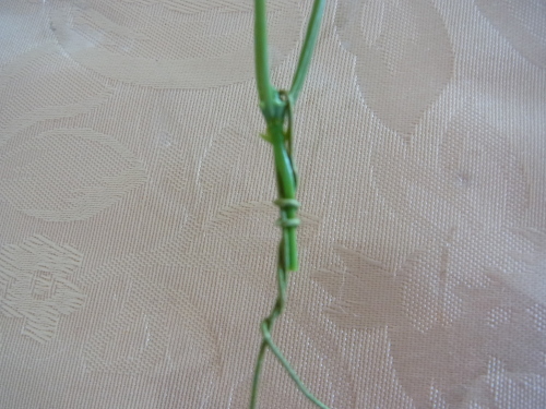 ケースバイケースですが、一緒におさえられるようなプルメリアの茎があれば、上からまわしかけてもOK、さらに花の押さえも強固になりますね。 |