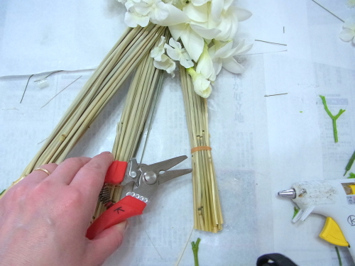 対角の位置をきめたら、両サイドのプルメリア二本をワイヤーで一旦固定して、を裏返しにして、茎と麦をグルーでとめます