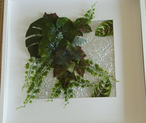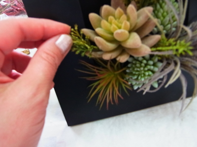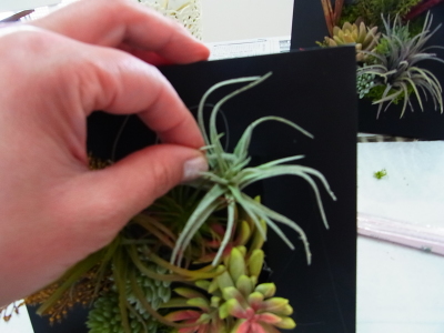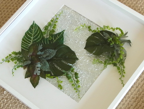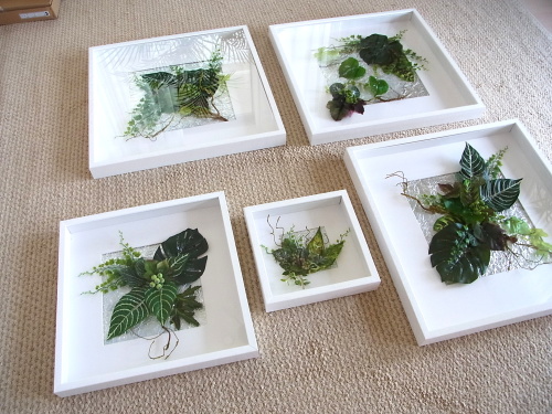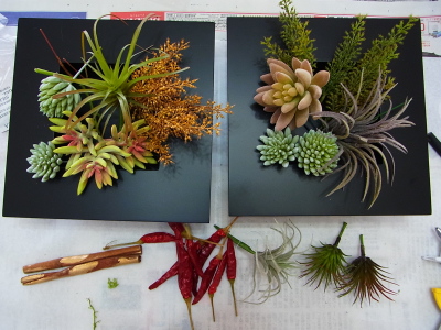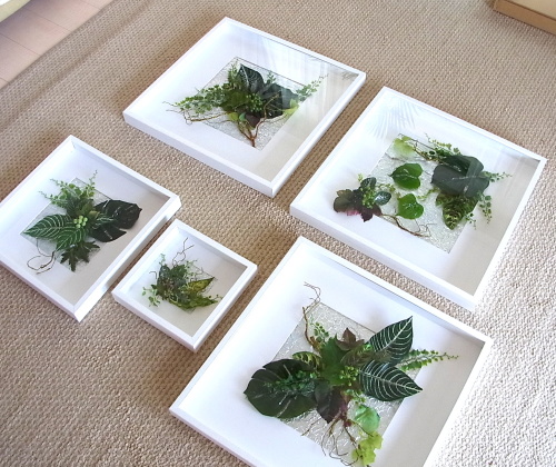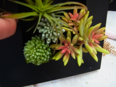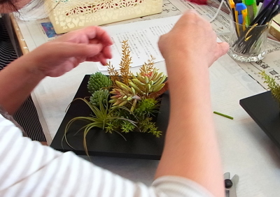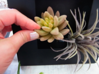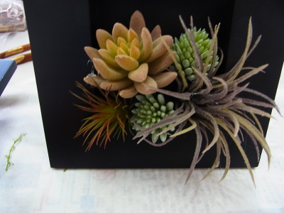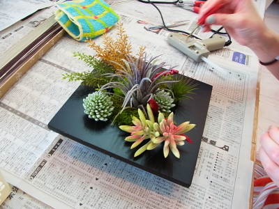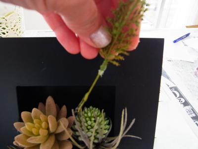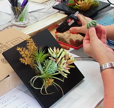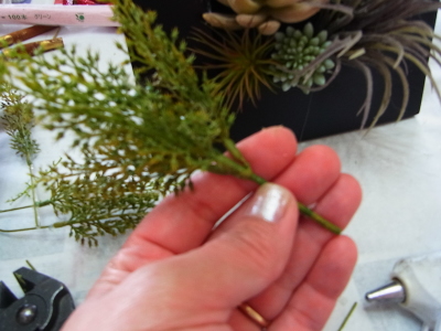 (2) メインにしたいものが決まったら、太いものは、出したい長さにカット、他のものは茎を折るなどして、フレームの底にグルーで留めつけます。