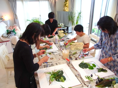 写真は立てていますが、重い花材は器を上向きにしてつくると重力でよくつきます。