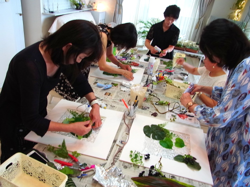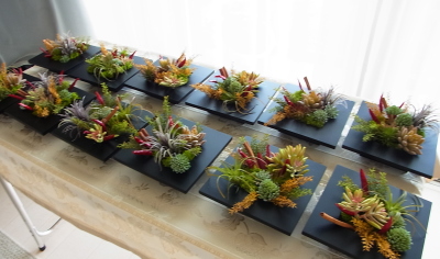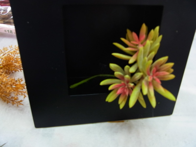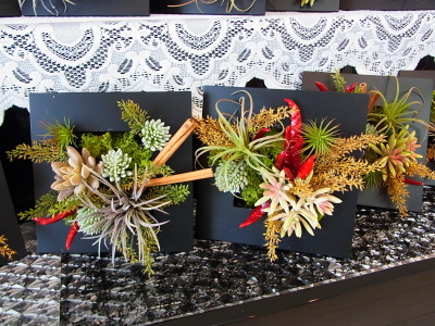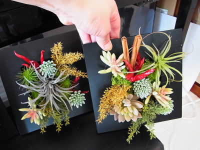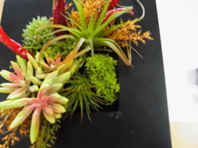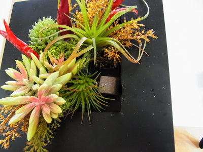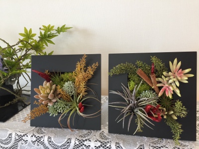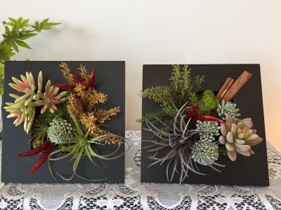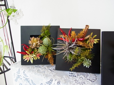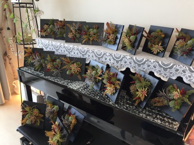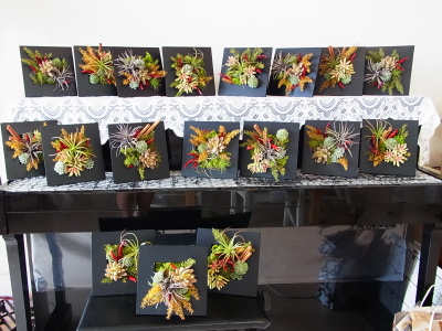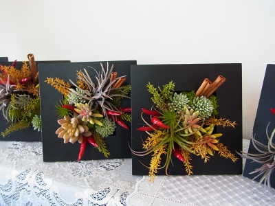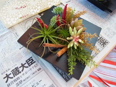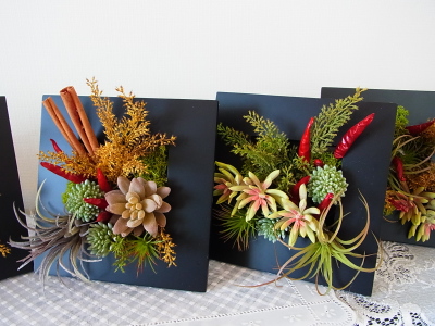 こんにちは いよいよ今年も秋に突入です。黒いボードなのでこれから長くかざれます。水引などそえれば さりげなくおお正月にもいけそうですね。