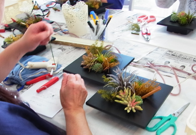 そして、 コイルにひっかけたり、器の壁面を足場にグルーで花材をとりつけていきます。
