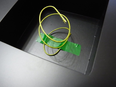 太いワイヤーでコイルをつくります コイルと器の接点をグルーで固定しあと、ガムテープなどで、、さらに押さえましょう。コイルの高さは淵まで。