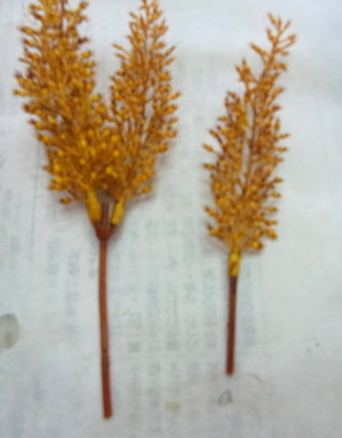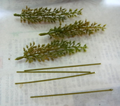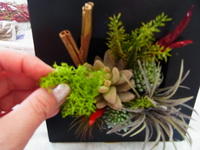 間引いた葉はワイヤリングするか、ワイヤーを後ざして茎をつくります。 こんな風にカットして、グルーでのせてもOK しあげに唐辛子、シナモン、モスを。