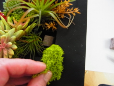 もし 穴がおおきくて、モスが奥に落ちてしまうときは 小さくカットしたフォームをちょっとだけ留めて、そのうえにモスをはりましょう。フンワリします。