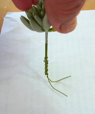 長すぎる花材はすぐには切らずに、L字Lに折れるものは追ってグルーをつける接地面に利用します。この花材は太いので折れませんので、カット。