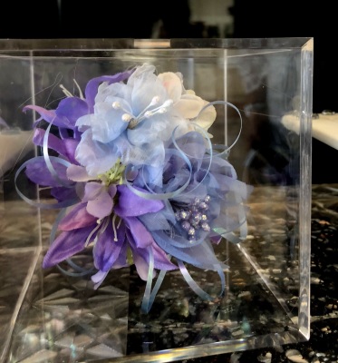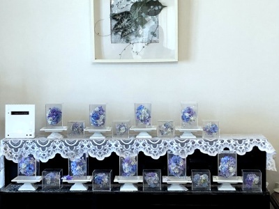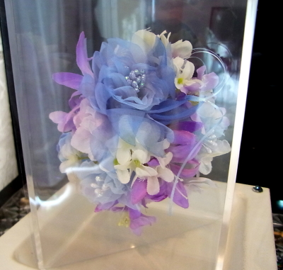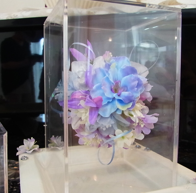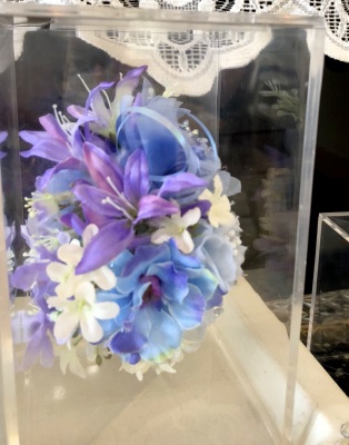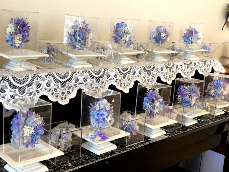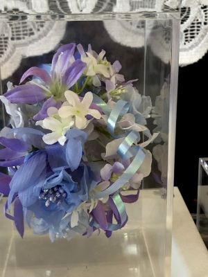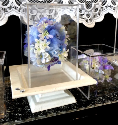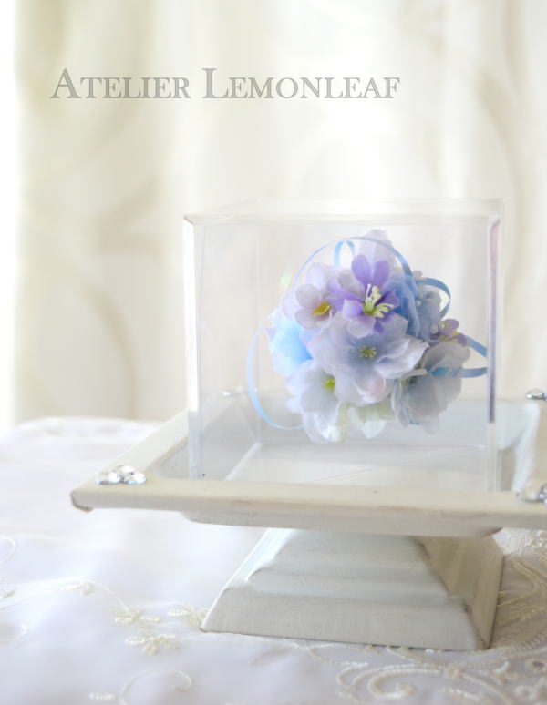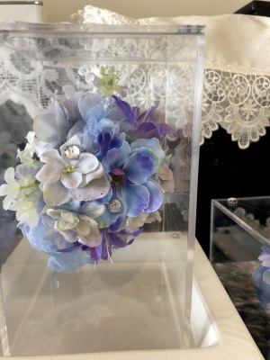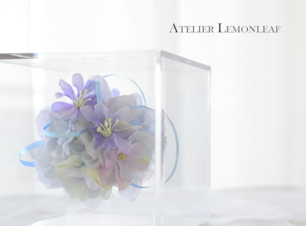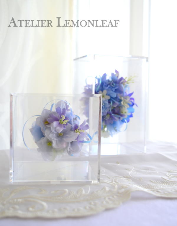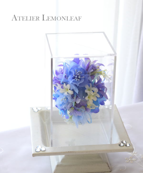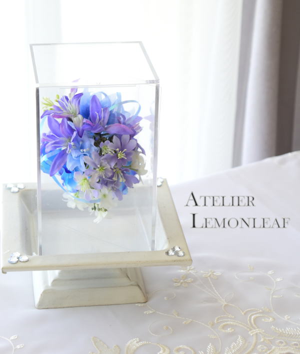 花材:染色花2種(ブルー)A ライラックA、デルフィフラワーA アジサイA、レースフラワーA ネリネA アクリルケース2種 リボン アクリル板 ラインストーン、アンティークコンポート