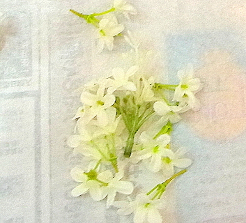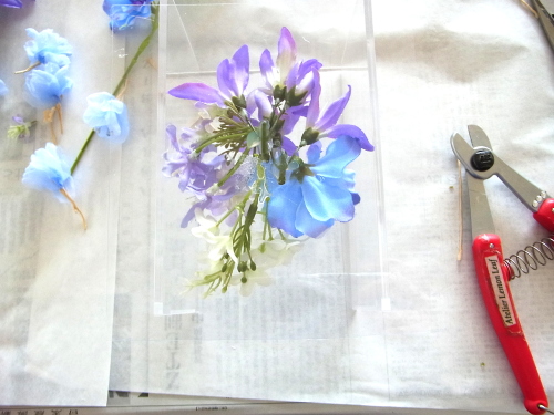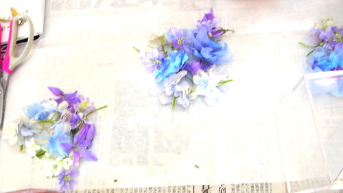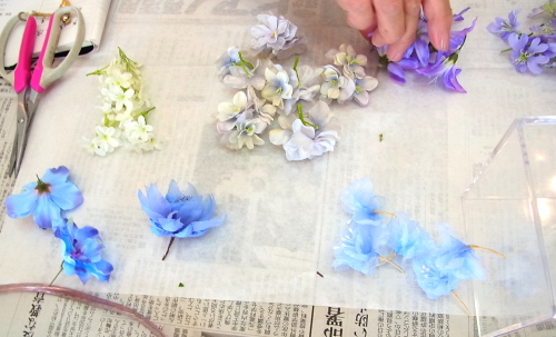 そのときは、小花などで隠しましょうすべての花材を茎 1.5センチくらいにカットします。 白い花はふと枝からカットします。。 あじさいは、ふと枝からはずして、小房にしておきます。必要に応じて、一輪はずして使います。 花材ををケースにあわせて大小二つにわけます。