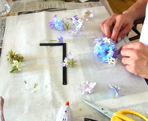 順番は上下左右、一番下の花から、そっととりだして、とめつけます。