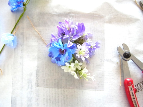 このとき花があたらないか、時々チェックします。高さ5センチ程度。裏面にして同じようにつくります。小さいほうも同じ要領で。