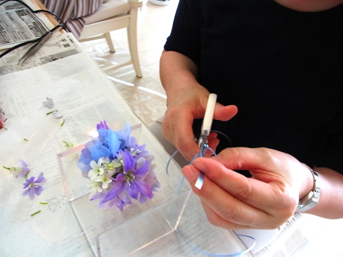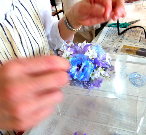 内側に茎をむけてつけていきますが、ドームの上のほうになる花材は高さを出すために、プレートにはつけておらず、すでにあるる花につけることが多くなります。 しあげはかならず脇もチェック、穴があいていたら残りの花材で埋める、または 花同志をひっぱってみましょう。