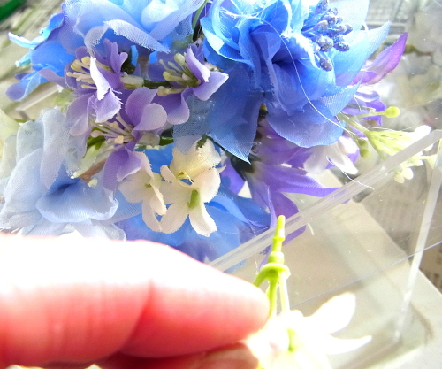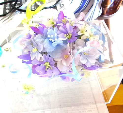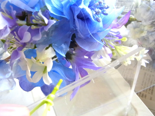 ケースを横にして、そこに伏せておくと、お花がつぶれません。