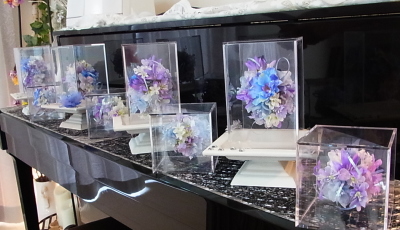 職人の方が一輪づつ染めています。一輪で千円近くするのですが、ほんとに色がキレイで素敵な花だと思ったのでとりいれました。