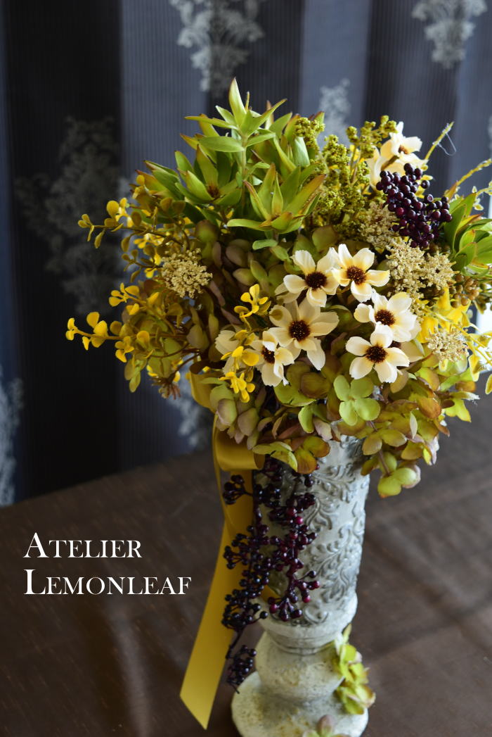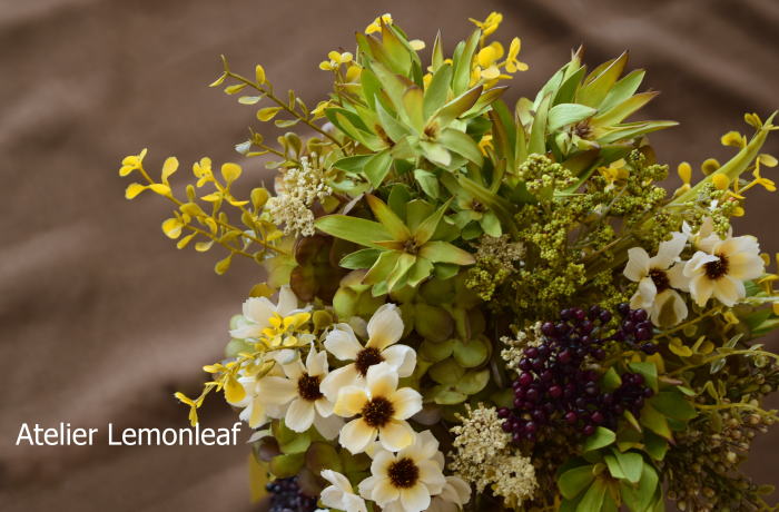 今回はドライのリューカデンドロンとアーティフィシャルのコラボ。私はドライフラワー出身なので、この花材の存在を知っていました。
