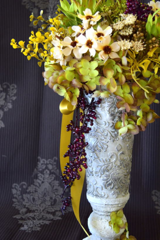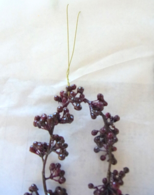 またアジサイをほんの少量とっておいて、器に垂れさがるように貼ることもできます。ただし一度貼って、はがすと、塗装がはげるので注意を。仕上げは長い実とリボンです。