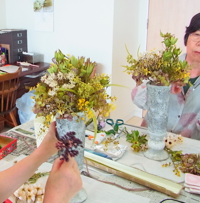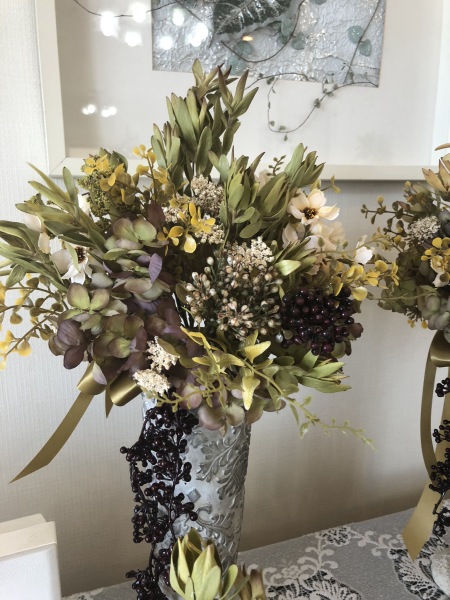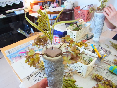 アーティフィシャルはジョイント式なので、いかようにもとりはずせます。ひとつひとうの花材とどう小分けにすつか、相談することがコツ