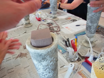 ゆるい場合はカットした破片や、新聞紙などをつめます。花材を準備しましょう