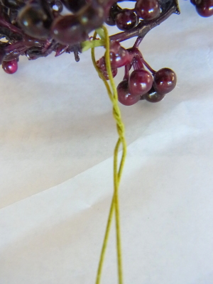 赤い実も二つにわけてつかうこともできますね。分けた方は叉がけのワイヤリングを。または、なにかにグルーではりつけてもOKです。