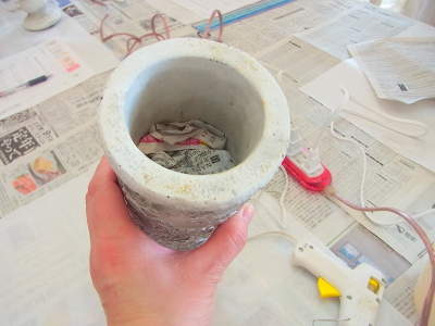 細長い器にはフォームはフィットしません。まず新聞紙などをまるめて、3/4程度まで詰めましょう