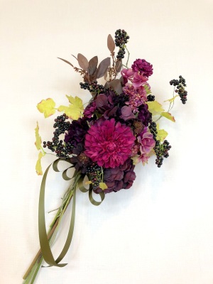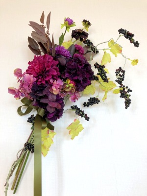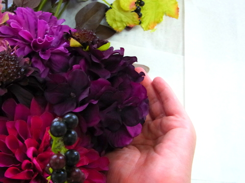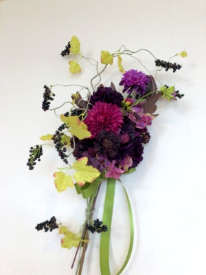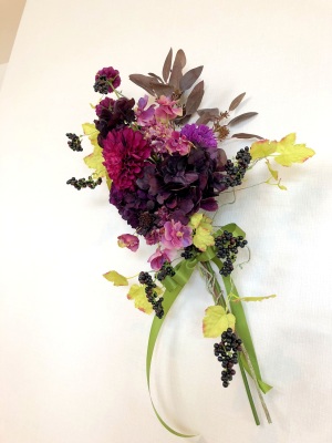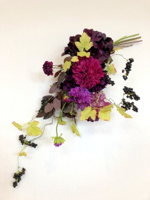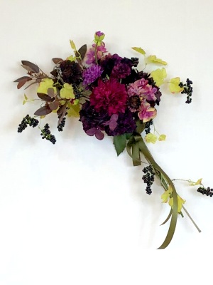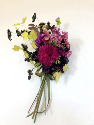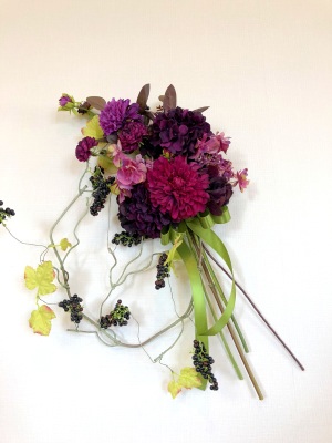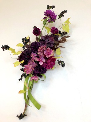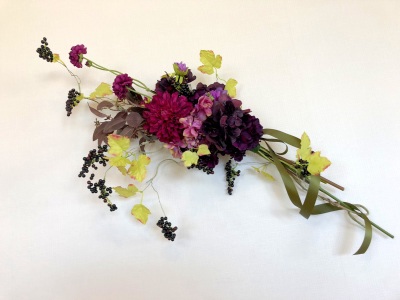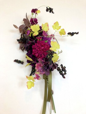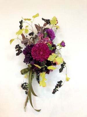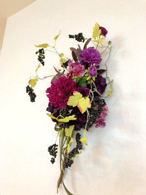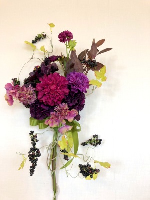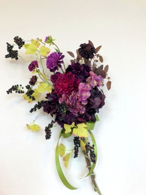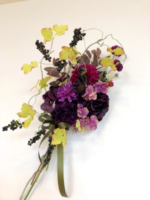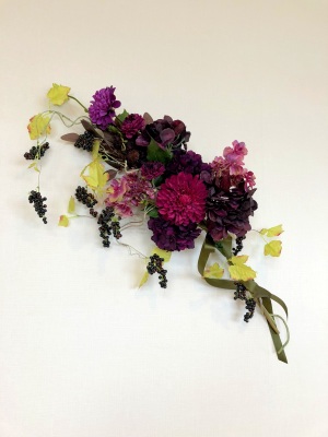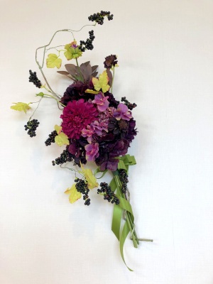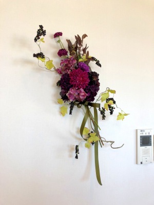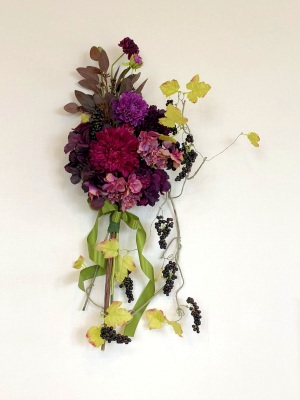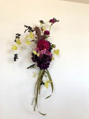 全ての花材がはいって、机においてみて、希望のシルエットになったら、壁にあててみましょう。