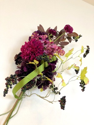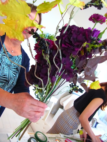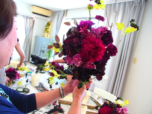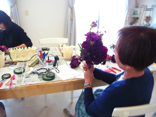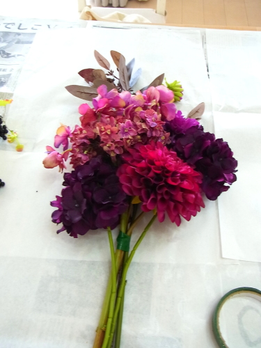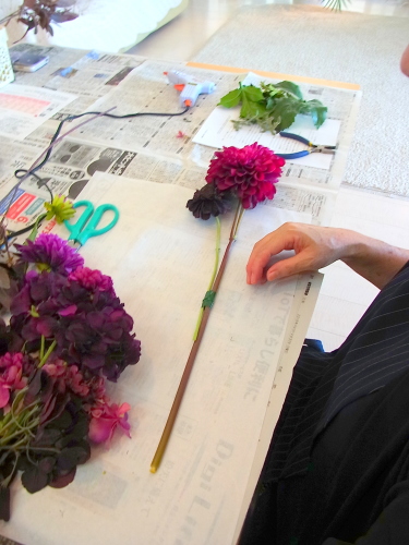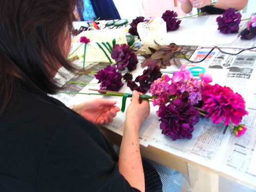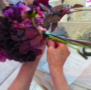 トップにする花材はお好みで、アジサイの方もいらしゃいました。みなさんいろいろでした。こちらも巻き留めたところ。 |