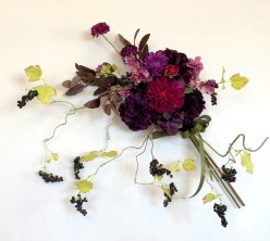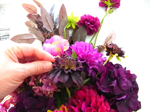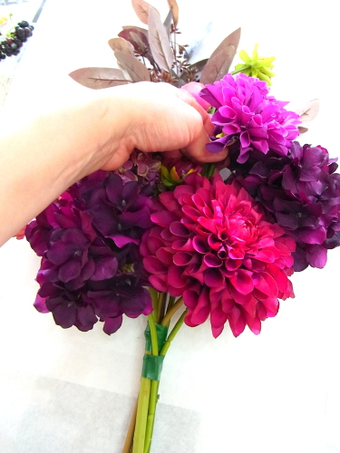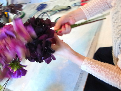 チョコレート色のユーカリは最後にいれます。一番いい場所は花たちがはいったあとに、見つかりますよ。 |