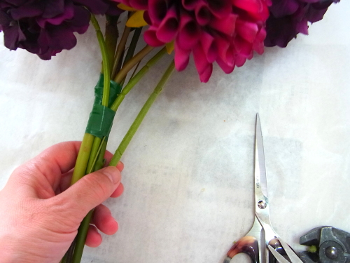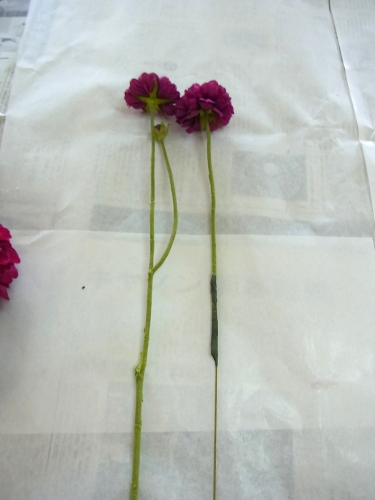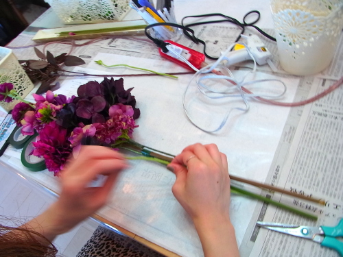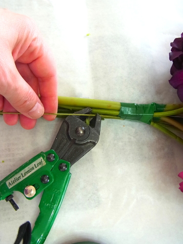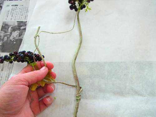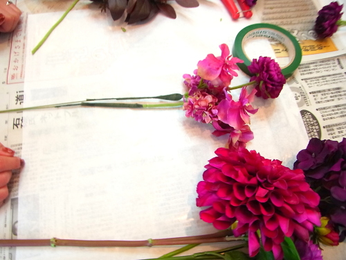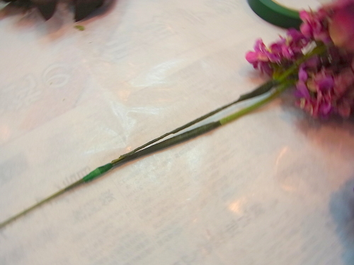 同じ高さで、二股に分かれている花材は片方をカット。太いワイヤを添え木してテーピングして、茎にします。