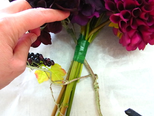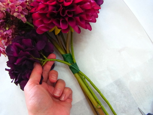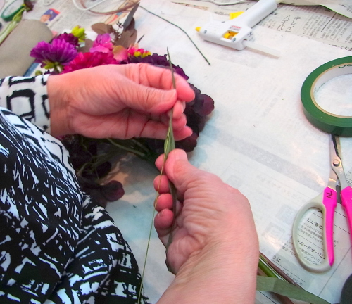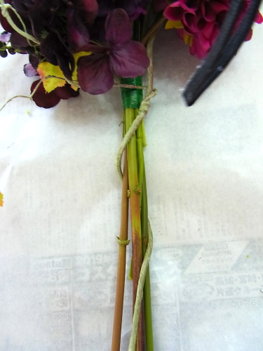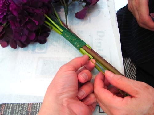 位置がきまったら、花束のテープ位置に巻き付けて固定します。 |