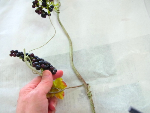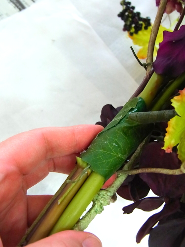 パインの茎の先端と、花の切り口の位置がずれても全くかまいません。つるの下のほうがあまったら、持ち上げたり、お花の茎に巻き付けておキレイです