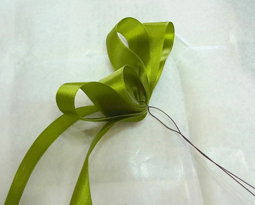 リボンをつくります。写真はすこし明るめのリボンですが、実際は深緑のリボンです。