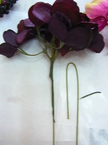 アジサイが4点、ヘッドだけのものには茎をつけましょう。太いワイヤーを1/3ほど、Uピンに曲げて茎の分かれ目にひっかけます。