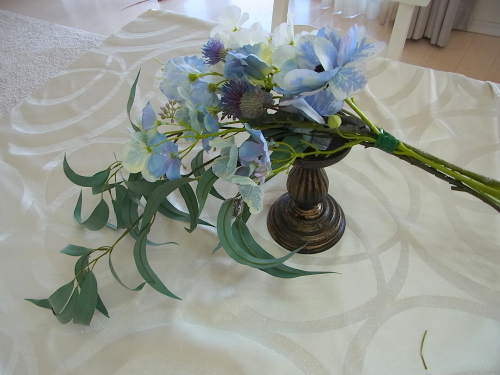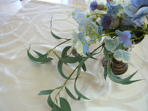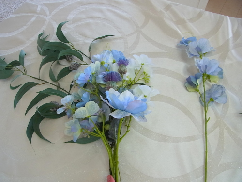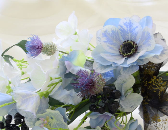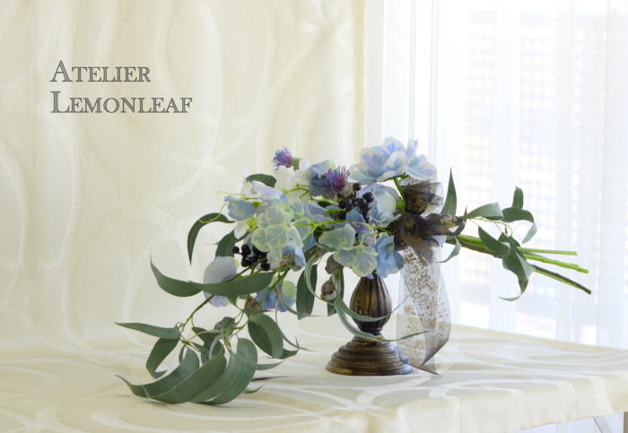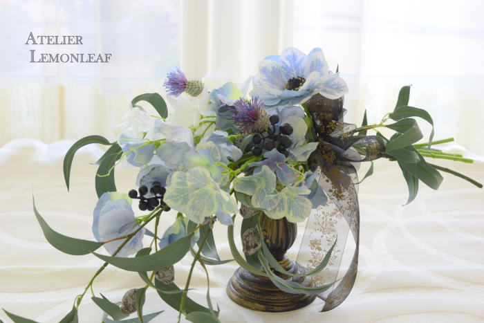 花材:アザミA アジサイ2種A、細葉ユーカリA アネモネA
