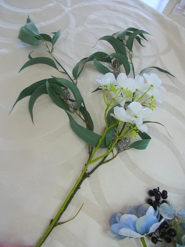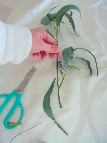 すべてが花の方向をあわせるのではなく反対側からいれると一気に手元が隠れます残りのユーカリも好みで好きなところに挿しましょう。 サンプルは反対側から挿してみました アクセントに実をつけます。
