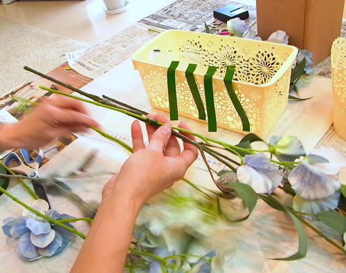 アトリエレモンリーフでは 教室で葉っぱシールと呼んでいますスイートピーを適宜カットして、ビニールテープ付近に花がたりないので、足します。グルーで花材に乗せ止めます。
