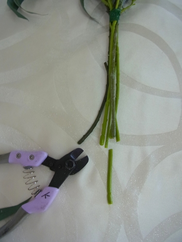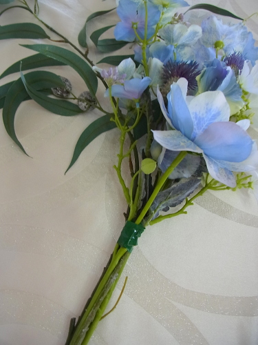 グルーは茎全体に長く広くつけましょう、接地面があれば花材同士でとまりやすくなります。長い方はさきほどのテープの部分に巻き留めてよいですし、あるいはカットしてつかってもOKです長い方もカットしてつかってもOKです