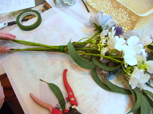 (3) ユーカリから順に、茎の下から20センチくらいの位置で好きな順番に花材をテープで巻き留め、スワッグをつくります。このとき茎は20センチ以上は必要です。テープは同じ場所で、巻いてください、最後に細葉ユーカリの葉で巻き隠します。