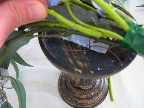 (5) スワッグ全体の下のほうのしっかりした茎をすくい、テープ位置は器の外に出るか、渕にかかるくらいの位置で、ユーカリのV字と茎の3点のバランスをみてベースに固定します。花を立体的におこしましょう。