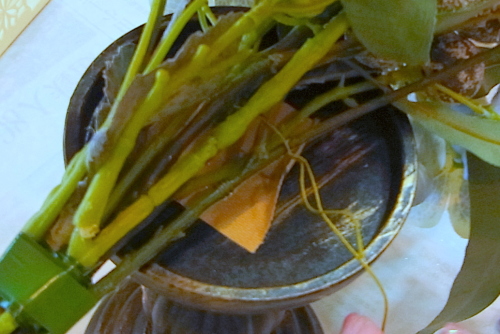 このアレンジの大事なところは ユーカリの二つの先端と茎の3点でバランスをとるところです。