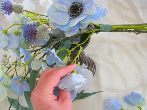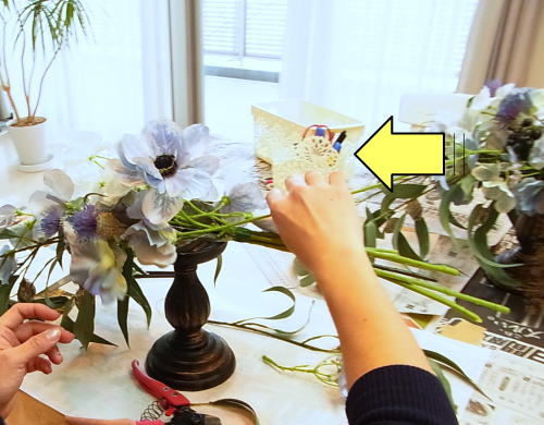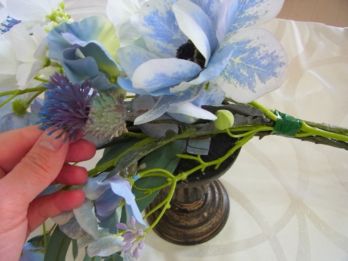 ユーカリの先端が閉じていたら、V字に開いてすきなカープにします。写真は下向きですが、上向きも自在、OKです。固定できたら、ここから花を起こして立体的にします。アーティフィシャルはとっても便利 あざみや、アネモネをしっかり際立たせましょう。