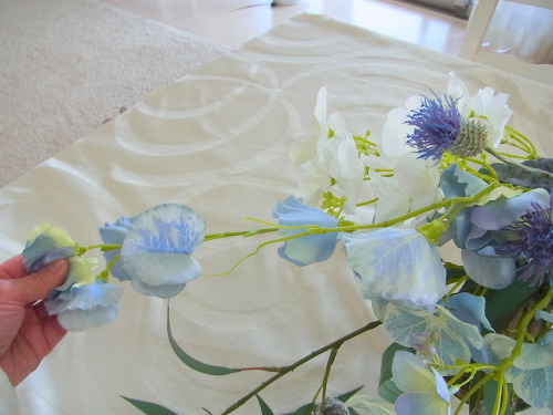 (6) スイートピーを小分けにして手元を隠したり、ユーカリの葉が重く重なるところは枝を小分けにして移動します。