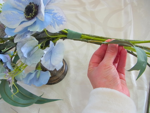 イメージが決まったら、一度解放して、V字のユーカリに1~2本、置いてはビニールテープで巻き留めます。