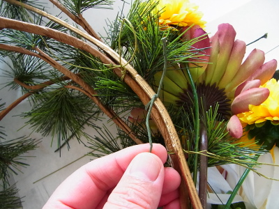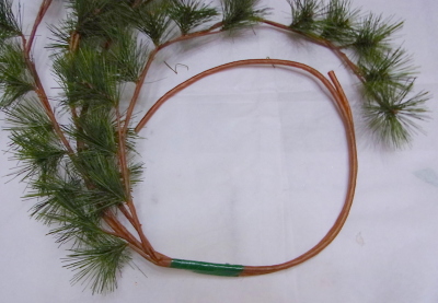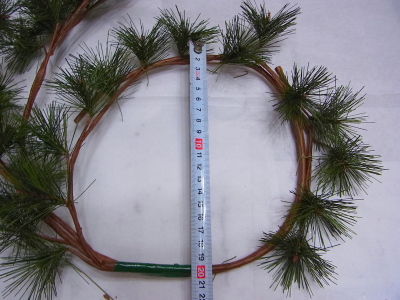 (1) 松を20センチほどずらして茎をとめます。ベース二枚を彎曲させて 二つを合体させます。直径20センチくらいにまるめて 短い松を円にそって留めます。松を全部正面に起こします
