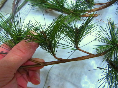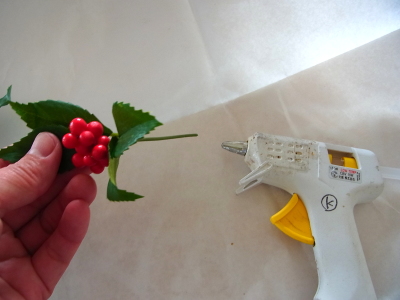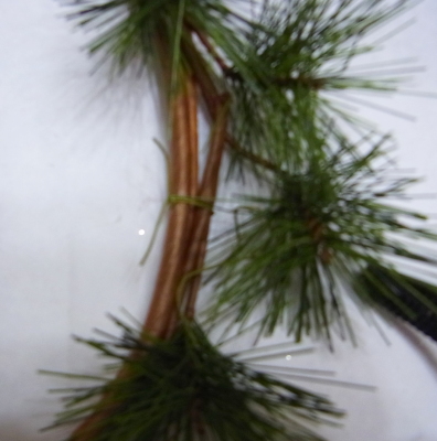 下のほうの松の枝に茎をみじかくしてグルーでとめてもOKです