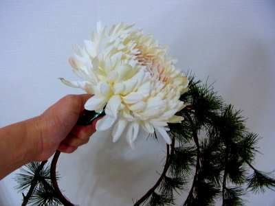 (2) 大輪の菊の茎を15センチくらいにカット、折り曲げて角度をつけて松にビニールテープでとめます。ピンポンマムも入れ、高くしたい時は茎は切らずに角度をつけて使用。低く入れたい時は短くカットしてグルーでとめてもOKです。